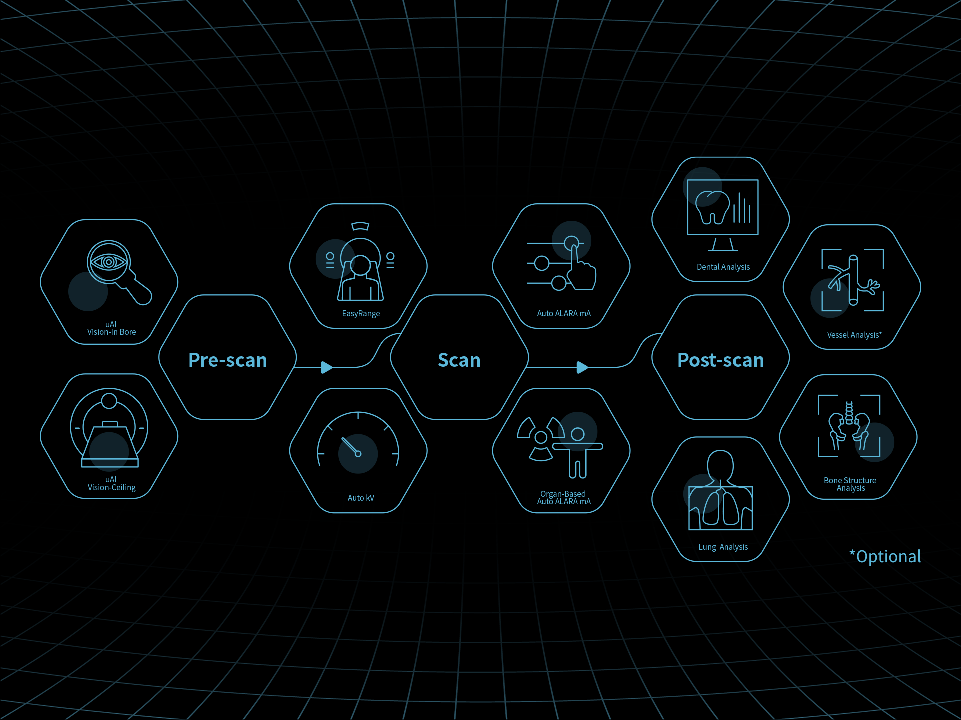 The intelligent workflow of the uCT Orion Extra offers patients and technologists a refreshing scanning experience that far exceeds expectations. With the innovative dual-camera uAI Vision seamlessly combined with multiple AI-powered algorithms, this scanning workflow not only elevates patient care to a next level but also markedly improves scanning efficiency.