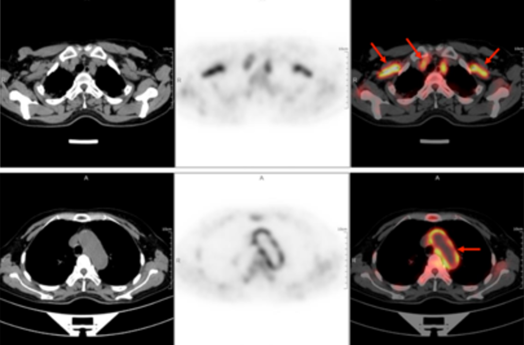 58-letnia kobieta trafiła do szpitala z powodu gorączki trwającej z przerwami od ponad 40 dni. Najwyższa zmierzona temperatura ciała wynosiła 38,9℃. Inne objawy obejmowały zmęczenie i ból stawów barkowych szczególnie nasilony po południu oraz nocą, dreszcze, krwioplucie, ból i ucisk w klatce piersiowej oraz duszności. Po dwóch tygodniach dożylnego podawania antybiotyków cefalosporynowych nie było poprawy, a gorączka się utrzymywała. W poradniach odnotowywano u pacjentki „gorączkę nieznanego pochodzenia”. W badaniu przedmiotowym nie znaleziono ewidentnych wskazówek pozwalających na diagnozę. Wyniki rutynowego badania krwi były następujące: wskaźnik sedymentacji erytrocytów w pierwszej godzinie – 72 mm; białko C-reaktywne o wysokiej czułości: 204,20 mg/l. Następnie u chorej wykonano badanie PET/TK całego ciała z zastosowaniem znacznika F-FDG (fluorodeoksyglukozy) w celu znalezienia przyczyny gorączki nieznanego pochodzenia.