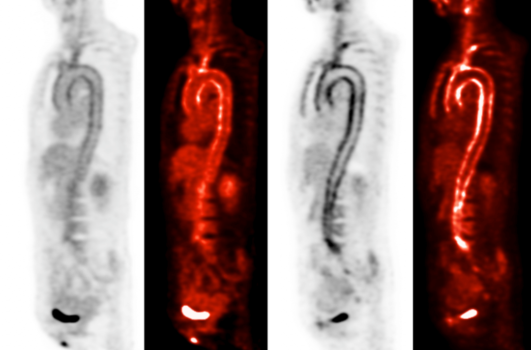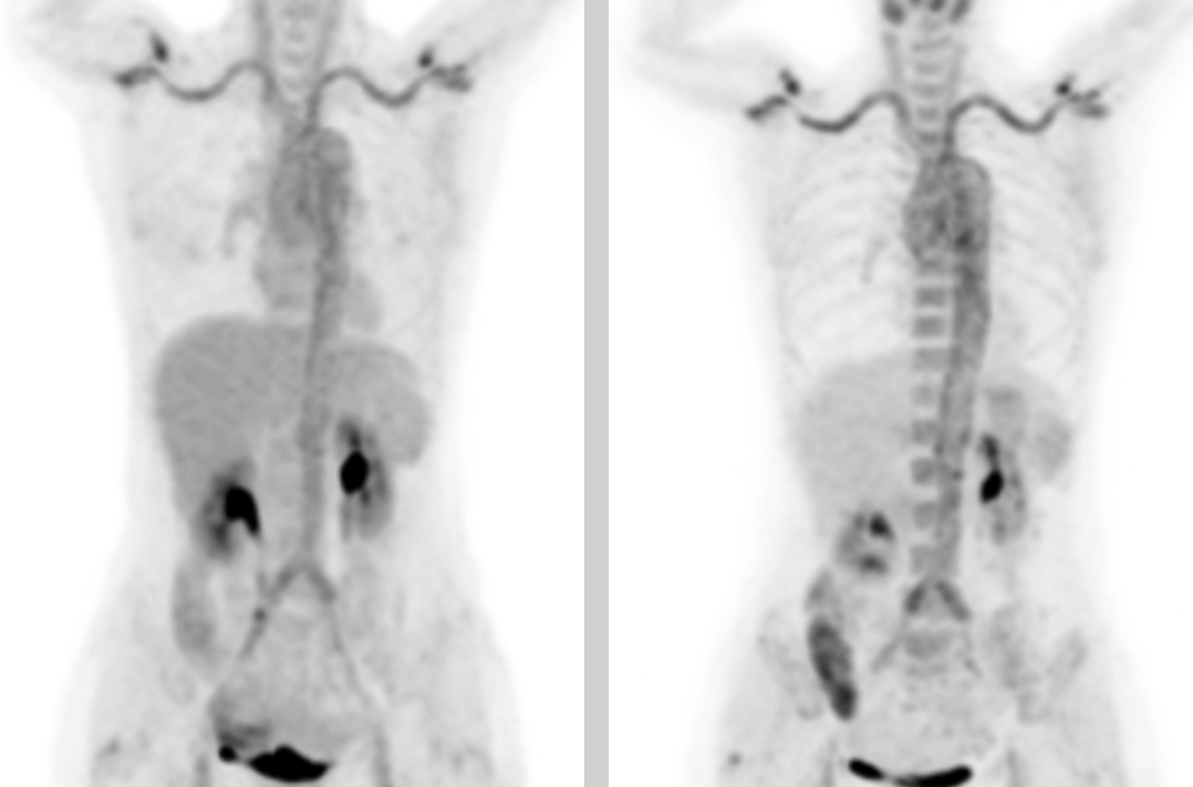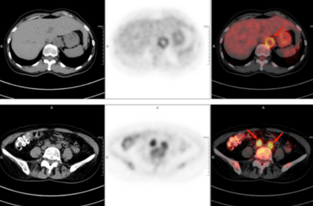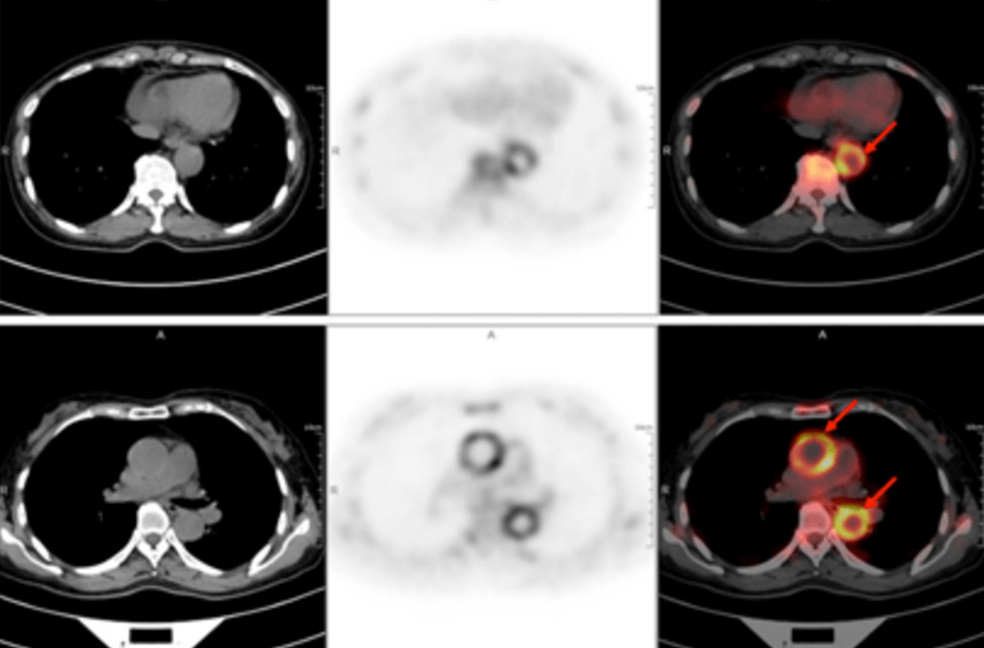 W obrazach PET/TK w kilku lokalizacjach (obustronna tętnica szyjna wewnętrzna, tętnica szyjna wspólna, pień ramienno-głowowy, obustronne tętnice podobojczykowe i pachowe, aorta piersiowa, aorta brzuszna, obustronna tętnica biodrowa wspólna, tętnica biodrowa wewnętrzna, tętnica biodrowa zewnętrzna i tętnica udowa) wystąpiło pogrubienie ściany ze zwiększonym metabolizmem glukozy, co uznano za spowodowane zmianami zapalnymi. Na podstawie wywiadu lekarskiego, objawów klinicznych, badania i wyników badań obrazowych u pacjentki rozpoznano zespół Takayasu. Po zastosowaniu standardowego leczenia przeciwzapalnego temperatura ciała spadła, a stan pacjentki uległ poprawie.